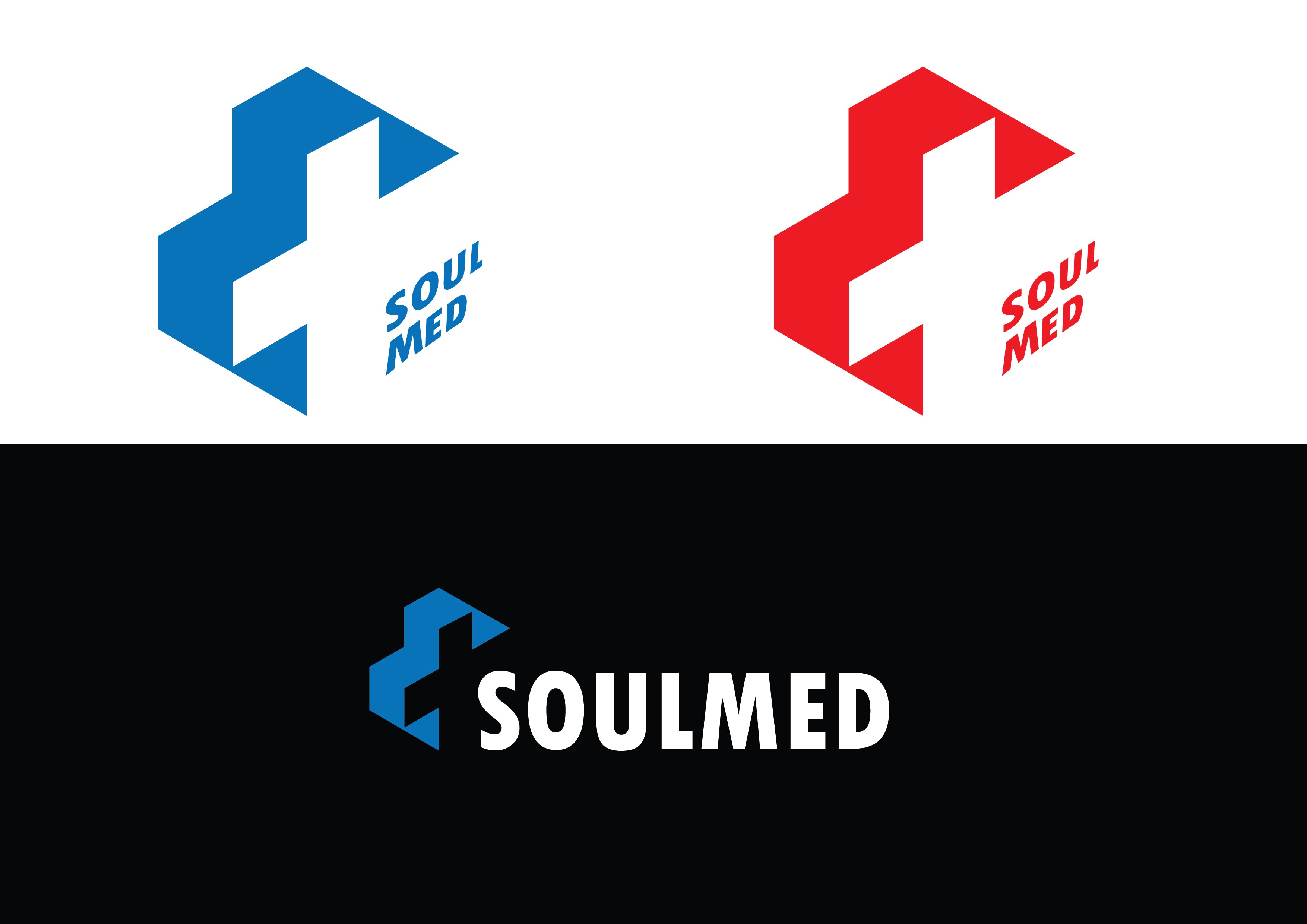 The final design uses a geometric 3D-inspired cross, symbolizing structure, stability, and interconnectedness — qualities that define a modern healthcare provider. The clean blue color conveys trust and calmness, while the angular shapes add a sense of precision and innovation. The name SoulMed is positioned within the form, emphasizing the idea of soulful medicine — care with depth, not just service. The result is a mark that feels both technical and compassionate.